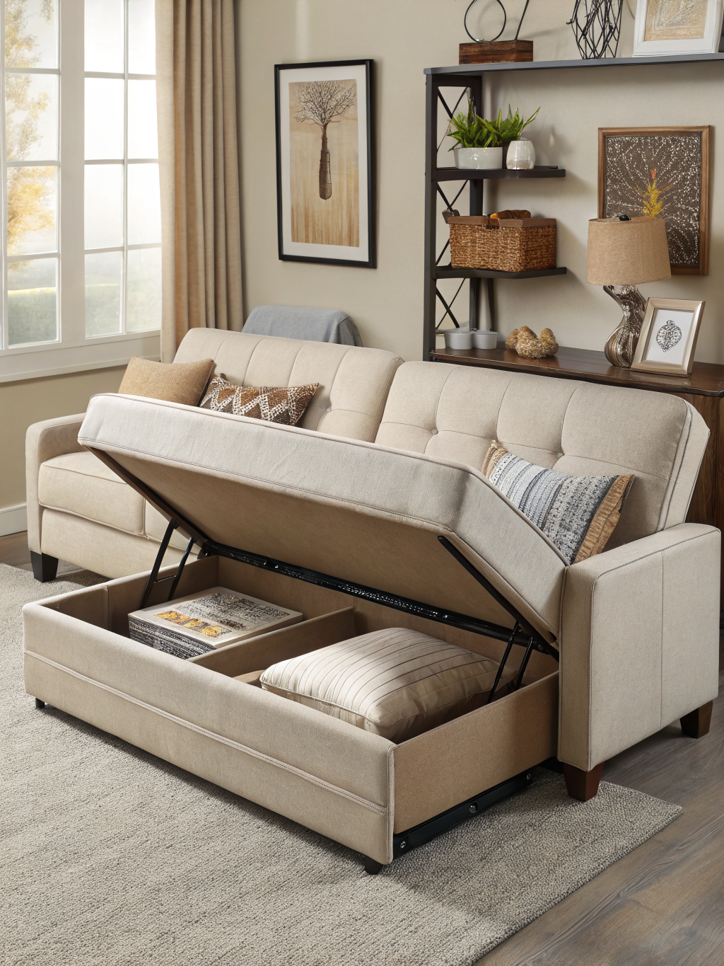 When space is limited, furniture that serves three functions instead of two has a clear advantage. A convertible sofa with storage combines seating, sleeping, and hidden organization.