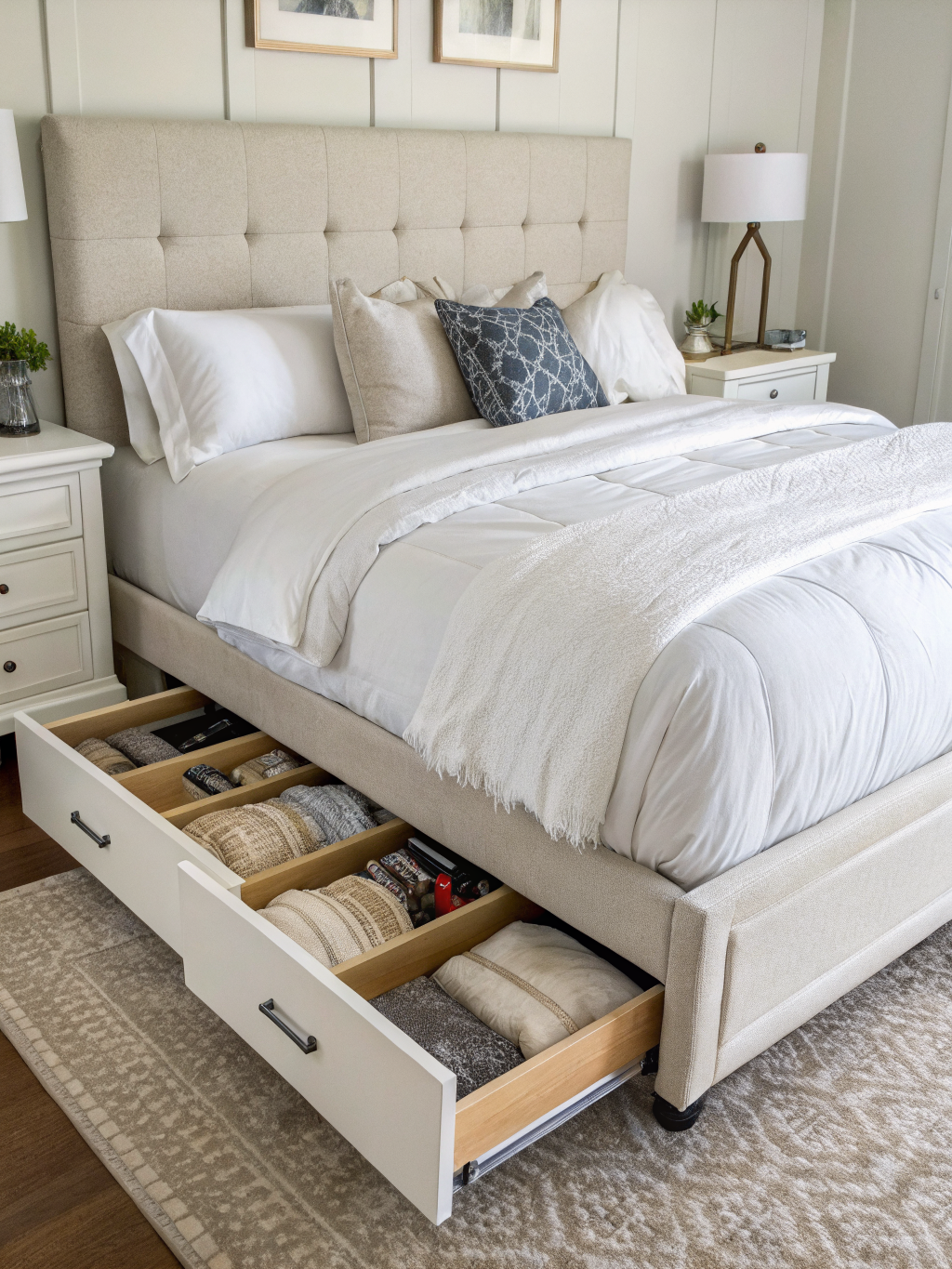 This is the “sweet spot” design: you get real built-in storage without committing to a heavy lift-up mechanism. The upholstered finish also makes a king bed look more refined in modern and transitional bedrooms.